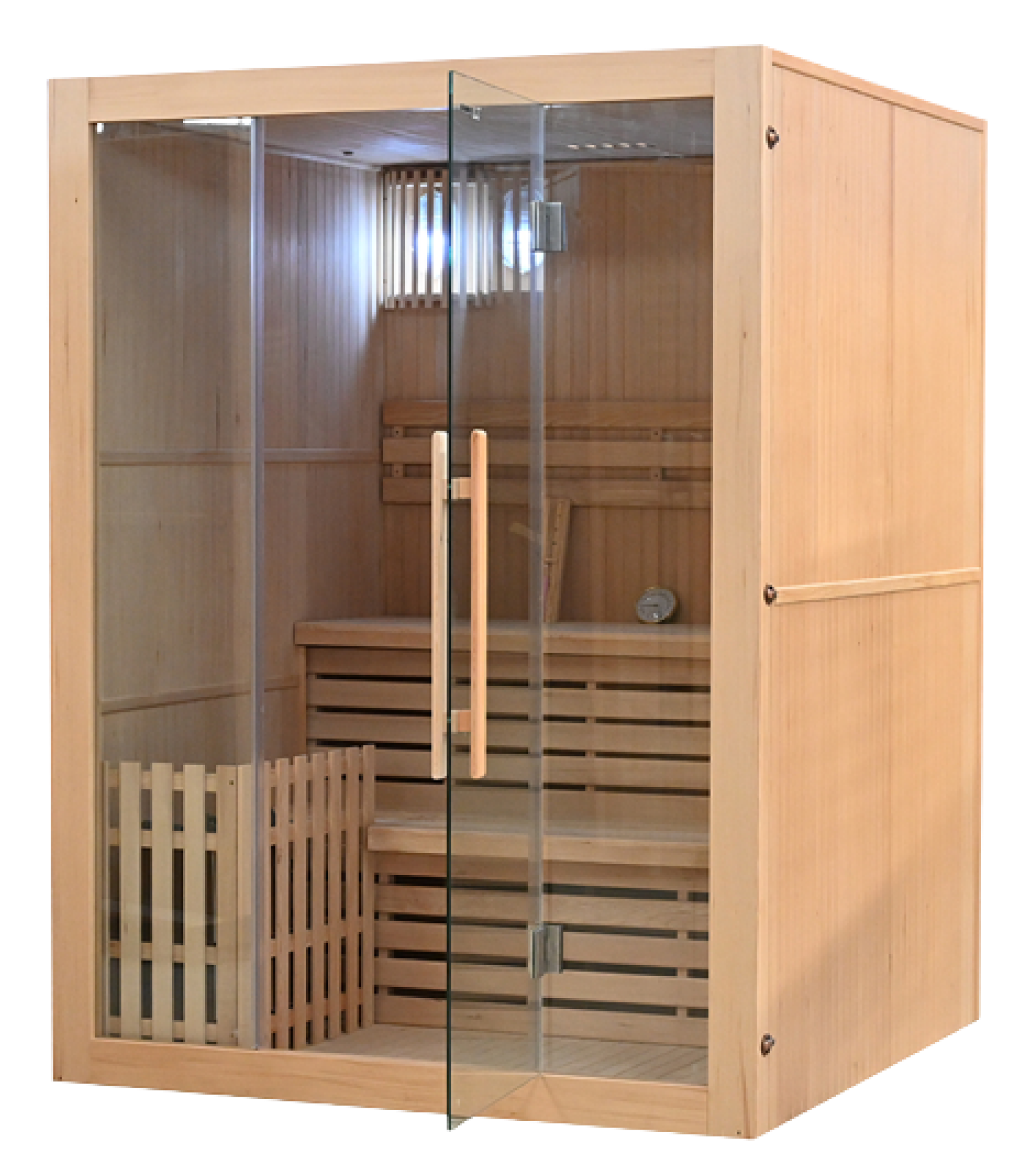 Piece do sauny nie są częścią wyposażenia, więc to od użytkownika zależy, czy użyje pieca na paliwo stałe, czy pieca elektrycznego. Zalecamy wyposażenie sauny w wysokiej jakości piec z opcją ustawienia czasu włączenia: można go włączyć natychmiast lub ustawić opóźniony czas włączenia według własnego uznania.